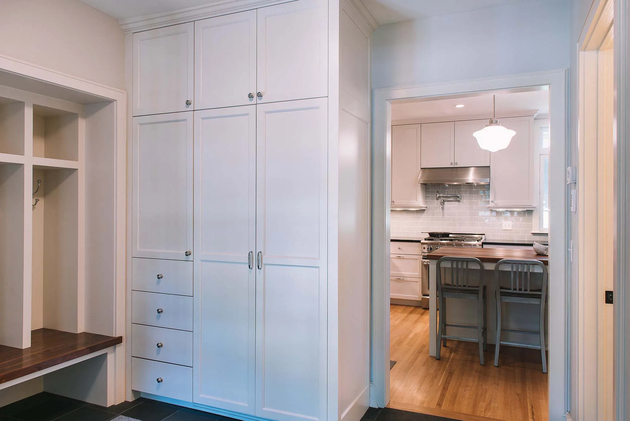 Your office should match home. See the Feders kitchen. Notice the cabinetry style there. We can carry that over. It creates a cohesive feel. Your mudroom can match too. Check the Mudroom cabinetry for inspiration. Flow makes a home peaceful.
